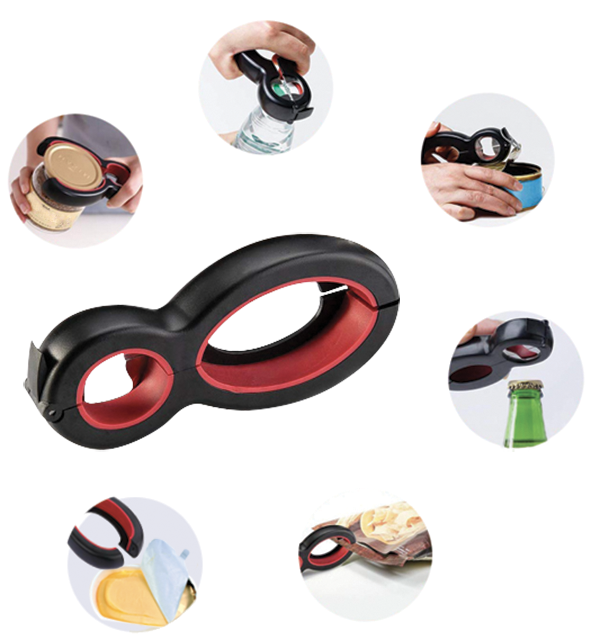 Este excelente utensilio 6 en 1 permite abrir frascos, botellas de rosca, latas, botellas con cápsula, sobres y tapas de forma rápida gracias a su diseño antideslizante y materiales de acero inoxidable y polipropileno. Robusto, resistente a la corrosión y un solo objeto para múltiples usos en tu cocina.